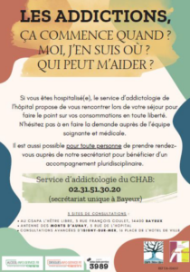 Le service d’Addictologie a pour objectif de proposer une aide et un accompagnement auprès des personnes souffrant d’une conduite addictive avec ou sans substance.